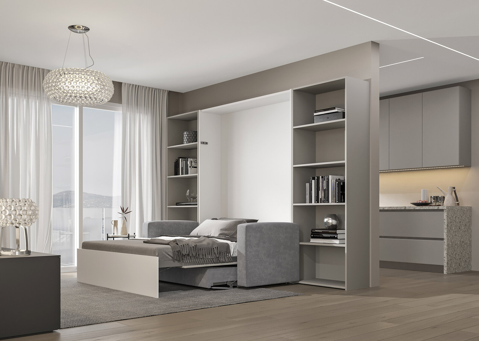 Rozhodující roli v designu obývacího pokoje/ ložnice hraje osvětlení. I zde existuje široká škála možností využití nepřímého nebo přímého světla, aniž by bylo nutné používat velké pokojové lampy. Skryté LED pásky, jako je Flexyled AT6, nebo nástěnná svítidla, jako je elegantní Tazzoli Pro s pohyblivou svíticí hlavicí a integrovaným vypínačem, dodají prostoru pro spaní útulný nádech. Do celkového obrazu harmonicky zapadají i panelová svítidla na posteli, jako je Area Light s funkcí stmívání.