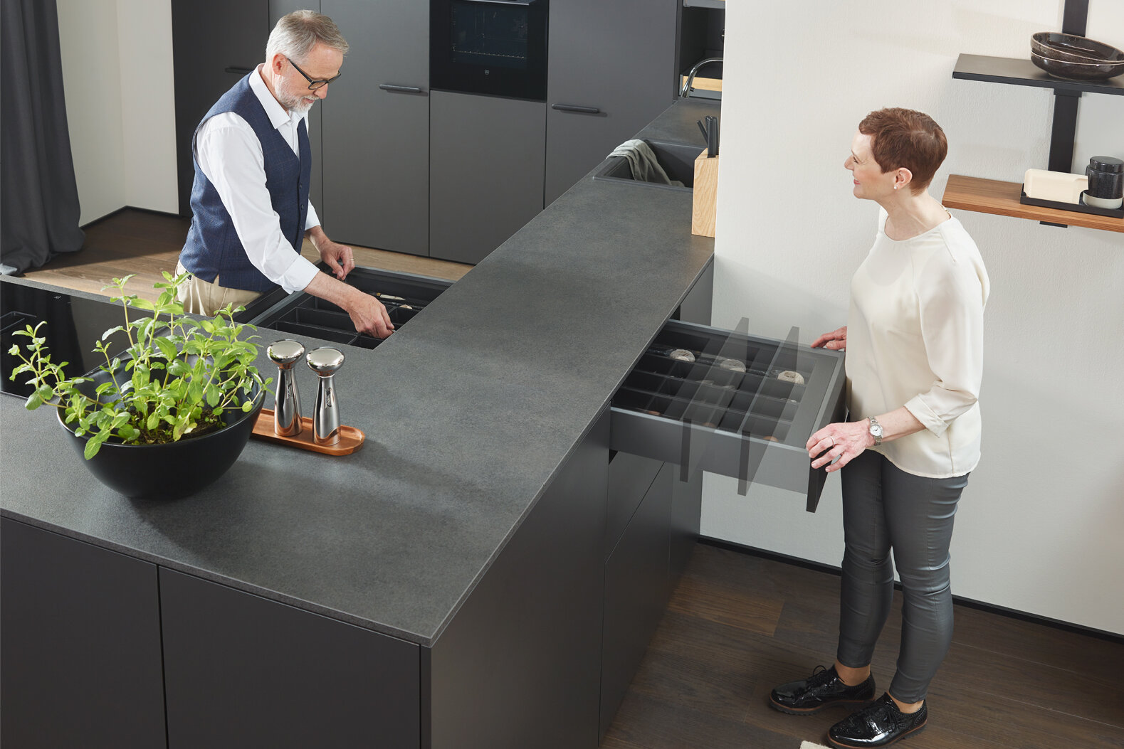 Výhody na první pohled: přístup k obsahu zásuvky ze dvou různých stran šetří čas a zvyšuje efektivitu čílko oboustranně výsuvné zásuvky překrývá na obou stranách korpus čímž je dosažen jednotný vzhled